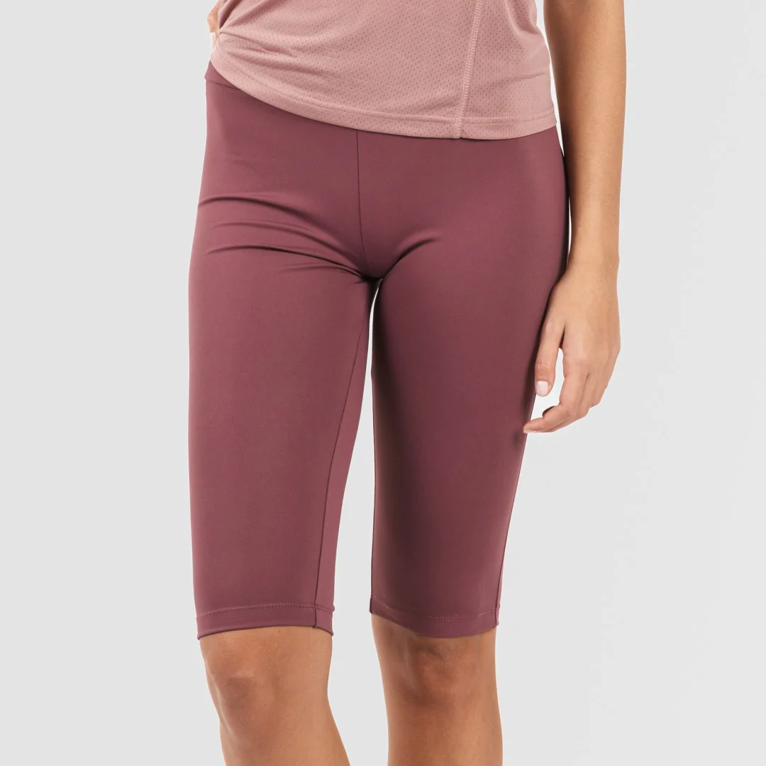Chándal formado por dos piezas, una camiseta olimpica de tirantes con tejido calado aireado en color malva y un leggings corto ajustado a la cintura en color berenjena.