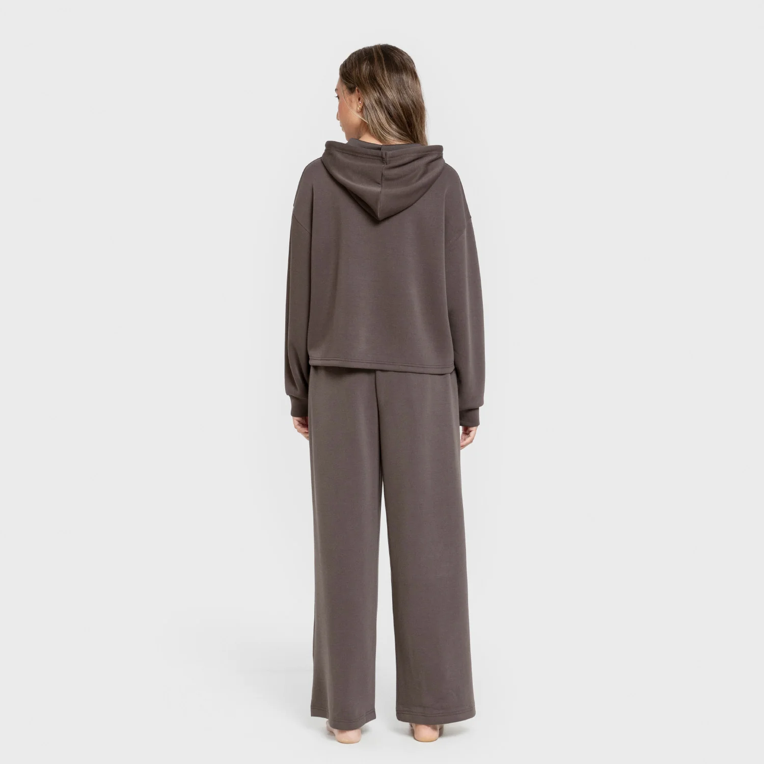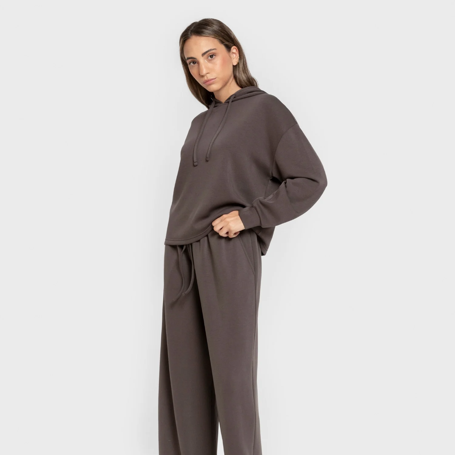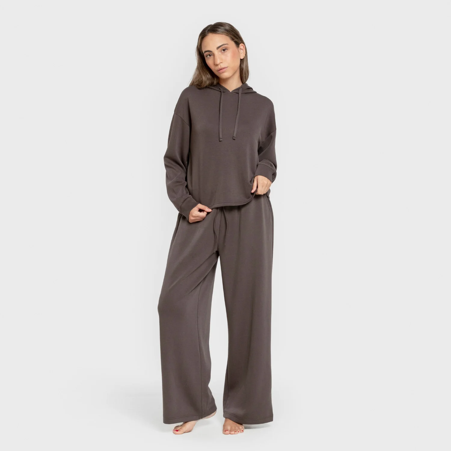 Pantalón largo ancho de corte «wide leg» con cintura elástica, bolsillos laterales y cordón ajustable.